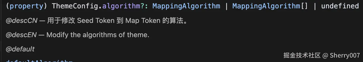 按照官方文档,token 分为基础变量(Seed Token)、梯度变量(Map Token)、别名变量(Alias Token),简单来说的话,Seed Token 是后面衍生出梯度变量和别名变量的基础,因为 antd 内部有一套计算这些变量的算法(下面就有)。我的建议是我们在这个属性下面主要可以设定一些基础主题变量(Seed Token),比如 colorPrimary 等,Seed Token 的全量列表可以看这里 - ant.design/docs/react/…