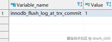 上文事务提交时提到一个刷盘策略的概念,实际上写入磁盘的时机是由MySQL系统参数设置决定的,我们可以键入下面这条SQL查看innodb_flush_log_at_trx_commit这个参数的设定值: