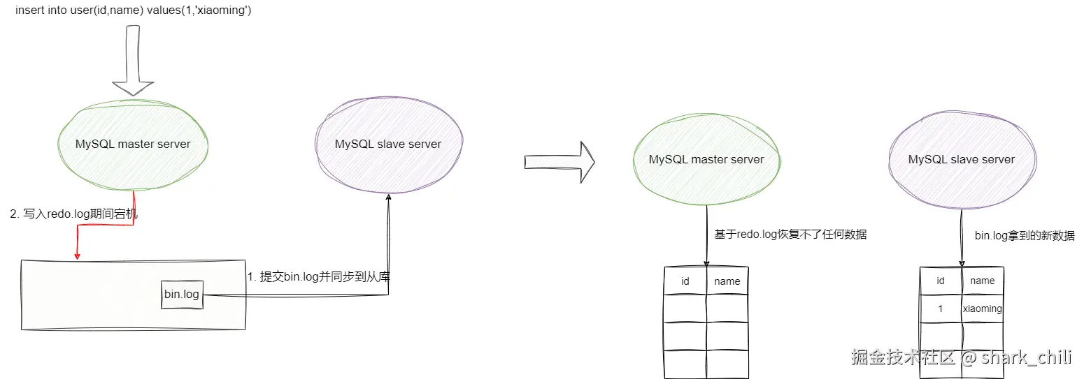 bin.log,当事务提交后bin.log写入成功,结果再写redo.log期间,数据库挂了。重启恢复后,主数据库根据早期redo.log(我们的redo.log没写入)恢复到bin log写入前的样子,而从数据库已经根据bin.log同步到了一份数据,最终从数据库比主数据库多了一条数据。