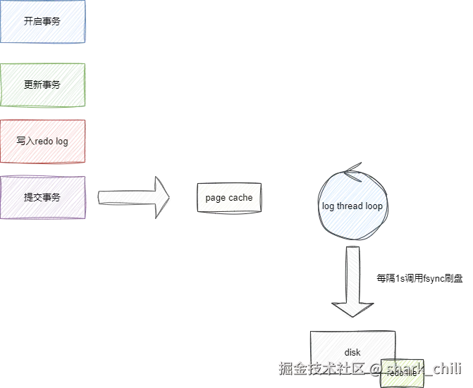 InnoDB使用一个事务日志缓冲区(transaction log buffer)存储事务redo log的日志条目,当该缓存区已满时,就会触发日志刷新将日志写入磁盘中。 - 后台线程定时刷盘:innodb后台线程会每隔1s调用操作系统fsync函数将redolog数据刷盘。