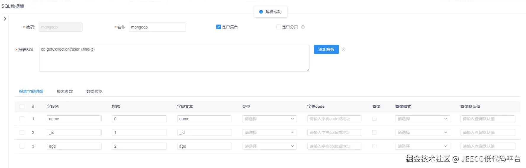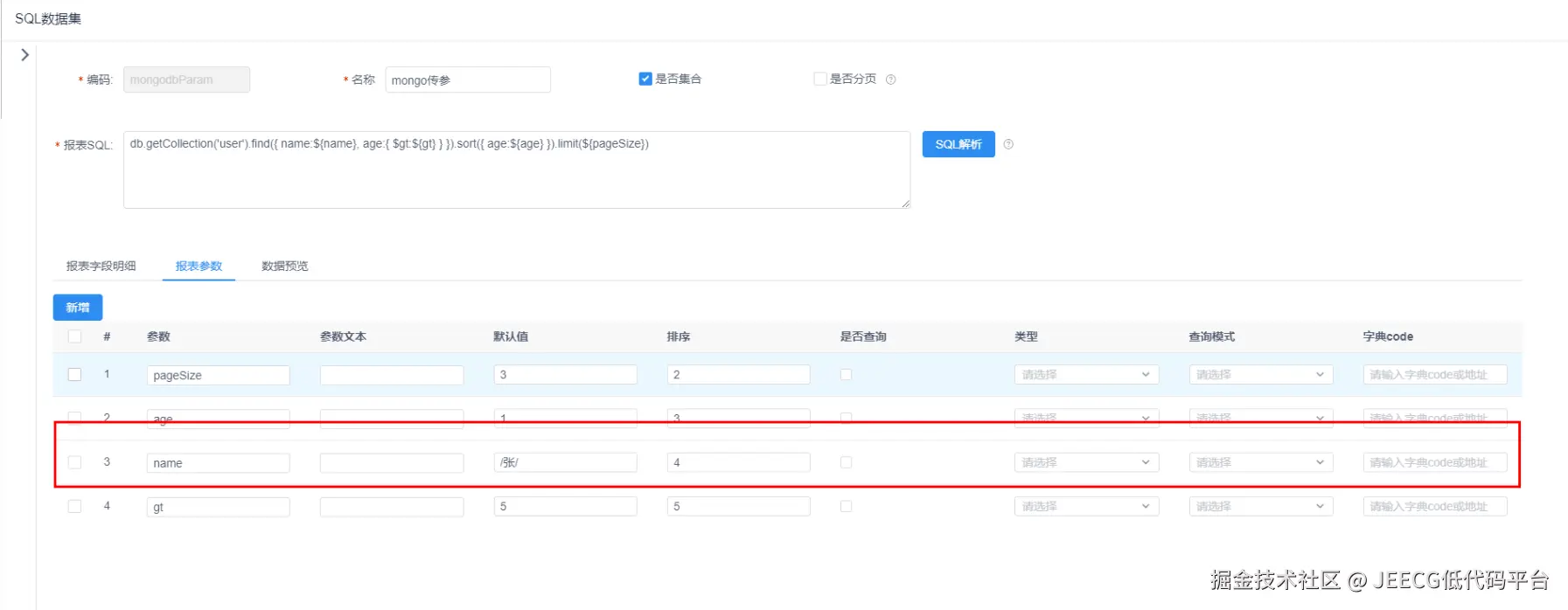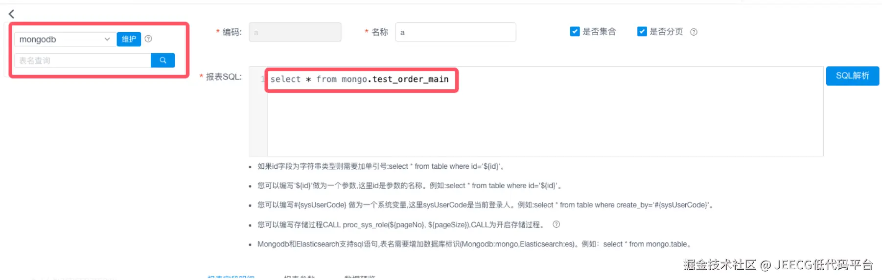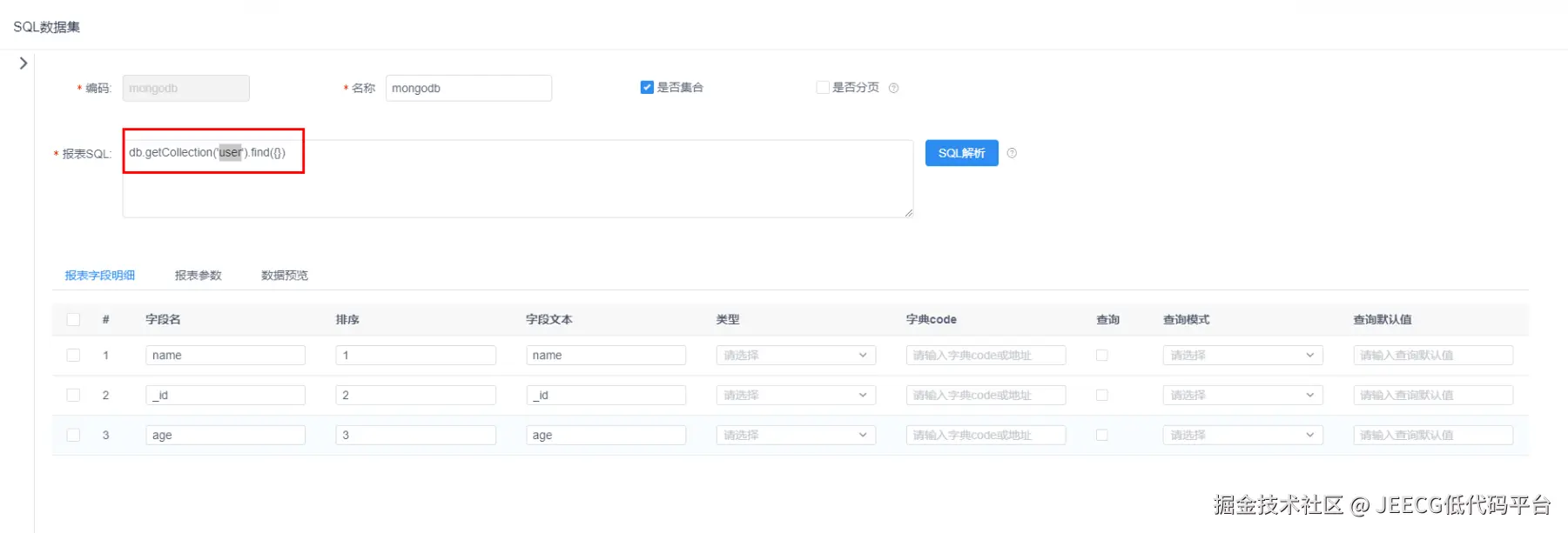 在报表SQL中配置满足标准的MongDB Sql语法,如下图: