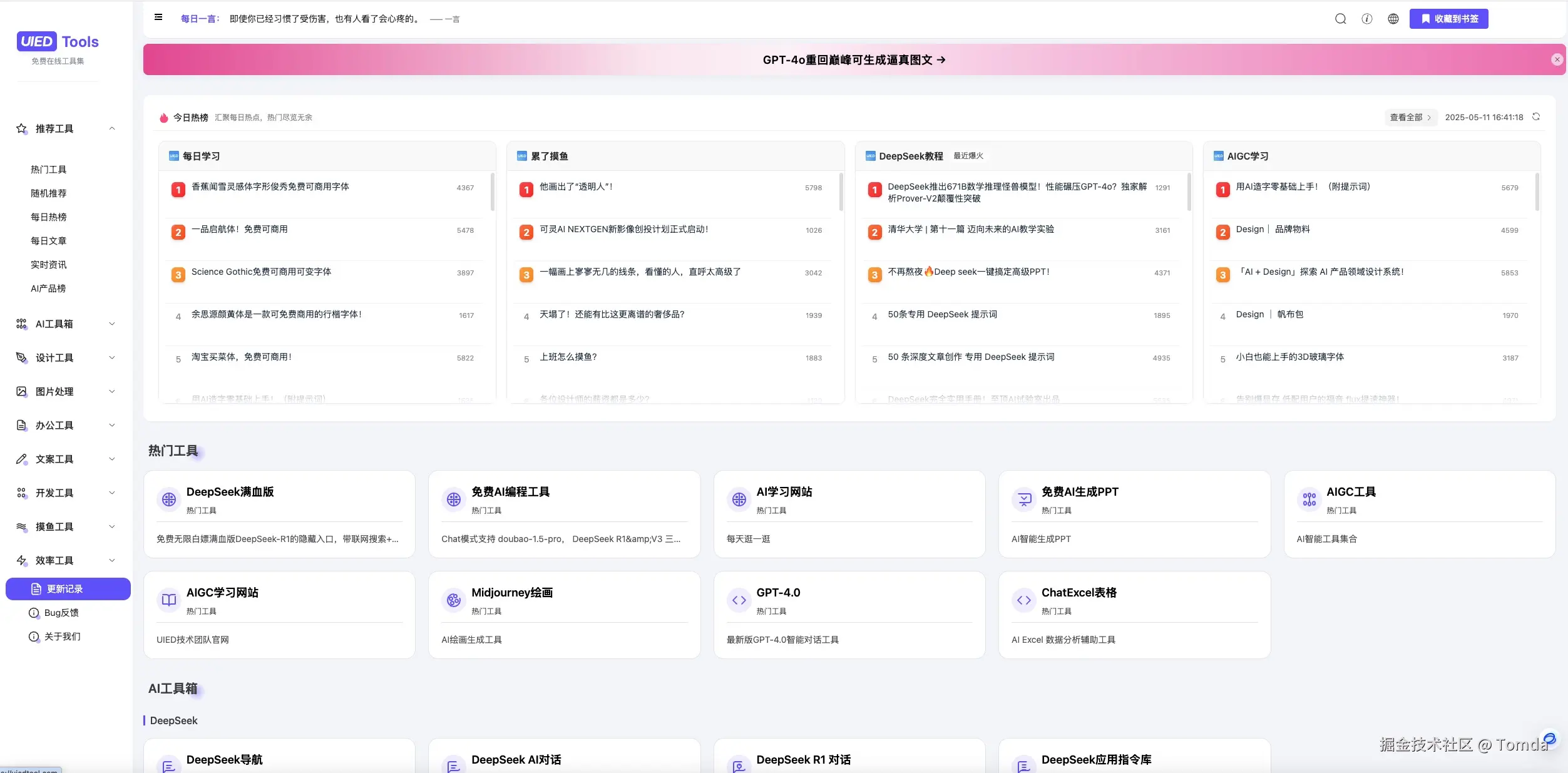 这是一个功能丰富的免费在线工具集合网站,集成了多种实用工具,包括 AI 工具、设计工具、开发工具等。该项目旨在为设计师、开发者和普通用户提供一站式工具解决方案,提高工作效率。
