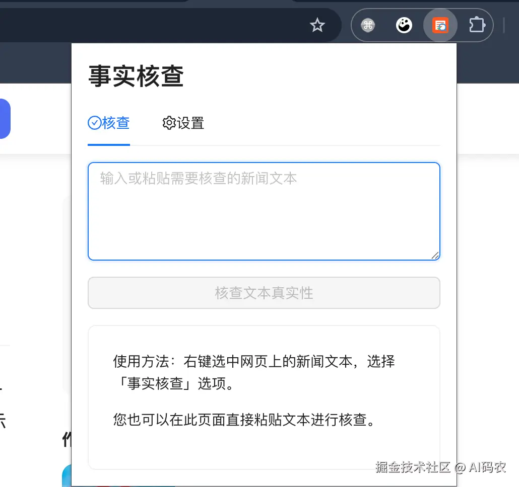 - 手动输入核查:点击插件的弹窗,手动输入或粘贴文本,进行事实核查。