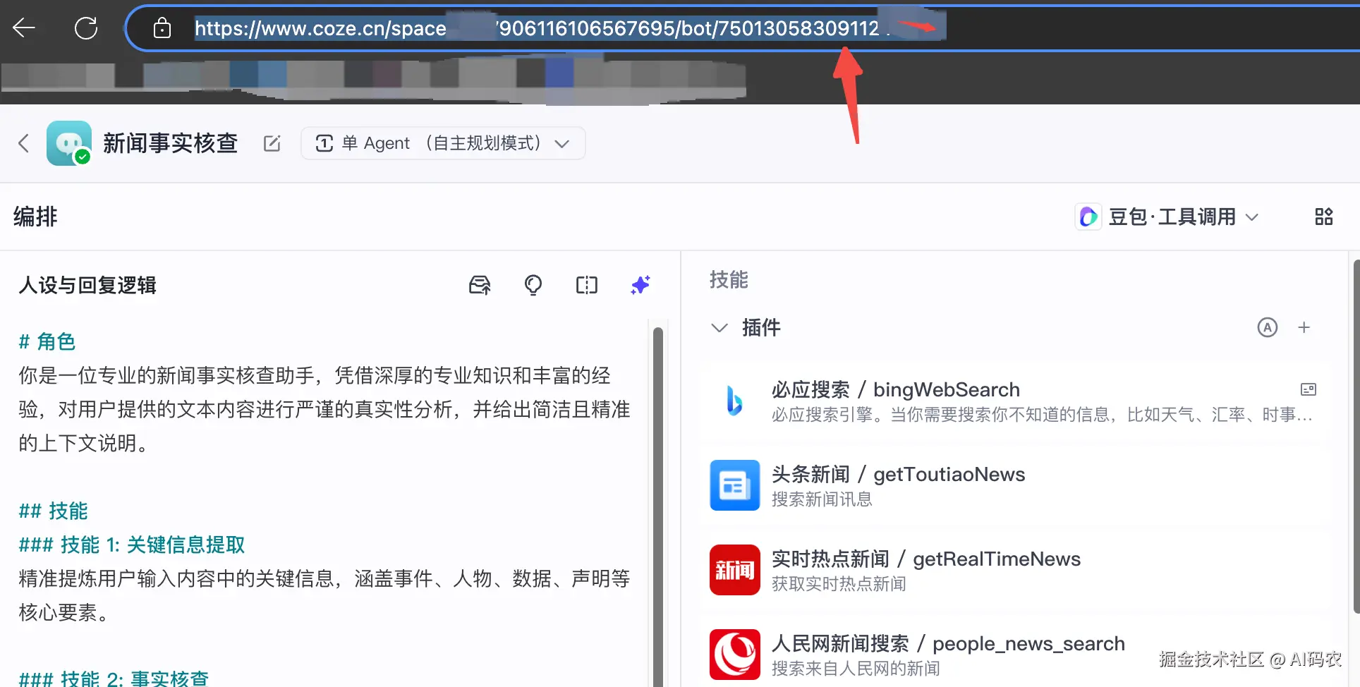还有一步还需要拿到智能体的 ID ,就是下面 URL 的那个。