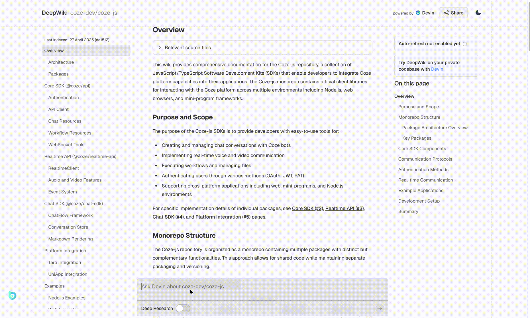 Coze 的 OpenAPI 接口跟标准的不太一样,如果直接让 Cursor 来生成,可能会有问题,比较好的思路是把SDK的README文档也给到 Cursor,或者先让 deepwiki 生成使用文档,然后再给到 Cursor,比如下面就是先问 deepwiki chat 接口怎么用, 然后再将内容给到 cursor。