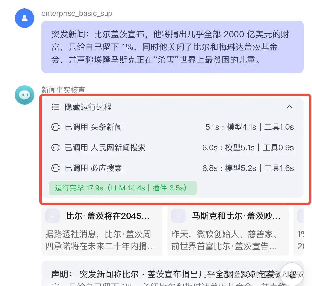 第五步,调试一下,可以拿一些新闻来做核实,智能体会调用插件,必须看到 智能体 调用了插件,比如下图,调用了三个插件,如果仅调用一个插件甚至没有调用插件,则是不合理的,效果会不太好。