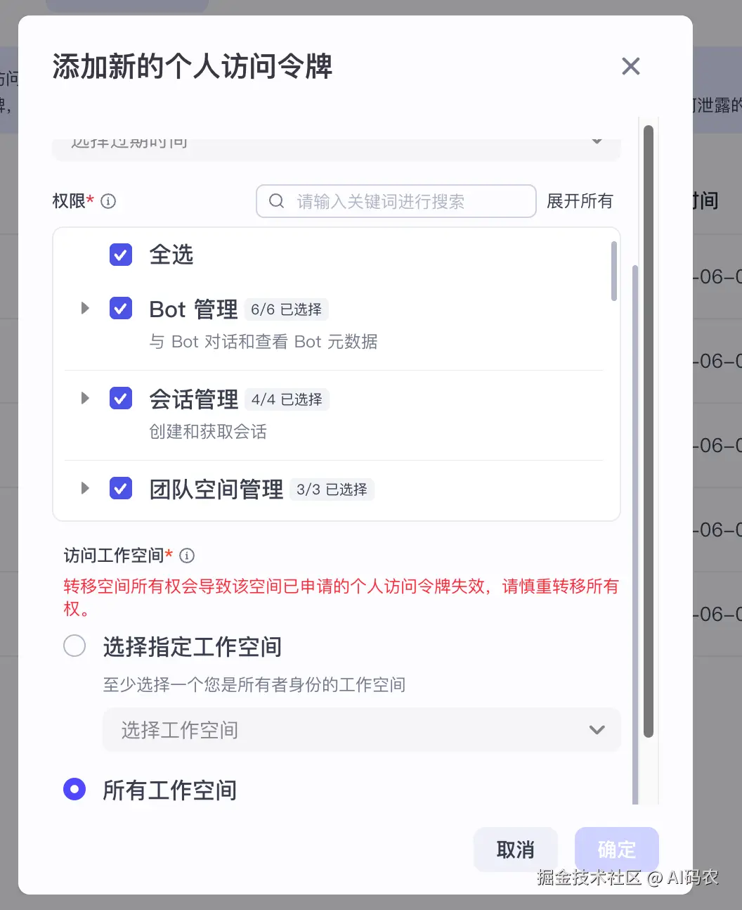 第二步,权限不知道怎么选的话,全部勾选即可,下面选“所有工作空间”