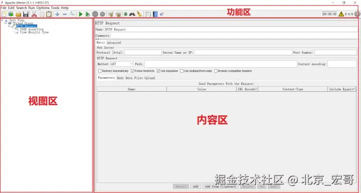 当JMeter以GUI模式运行时,窗口主要由三部分构成: