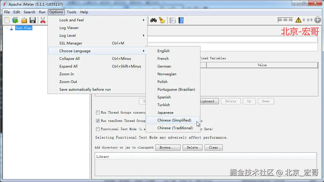 依次点击Options-->Choose Language-->Chinese(Simplified)即可配置成中文简体,需注意的是该方法只对当次生效,下次打开Jmeter依然是英文。如需永久生效,请使用下面两种方法。
