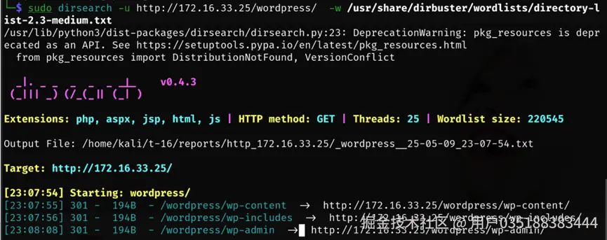再次使用dirsearch工具对http://172.16.33.25/wordpress/ 进行路径遍历。找到几个路径: