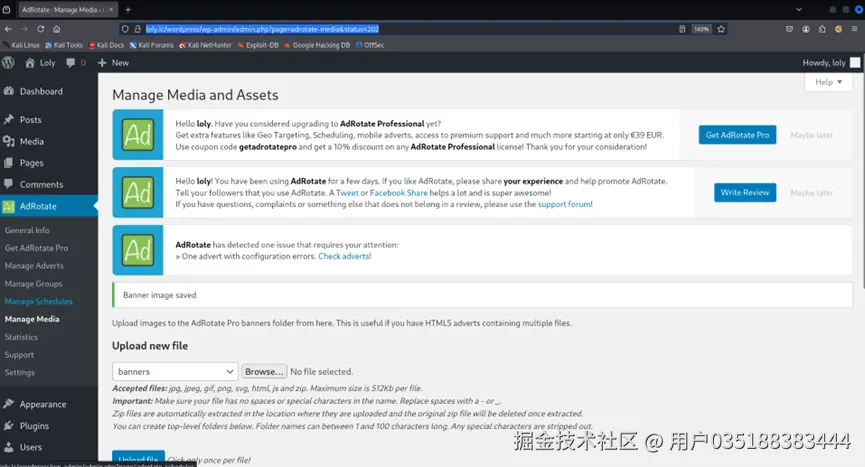Vulnerability Explanation: Linux服务器所部署的CMS- wordpress框架的插件—AdRotate有文件上传漏洞,允许用户上传可执行文件。导致服务器可以被攻击者获取低权限用户,wordpress的配置文件wp-config.php中包含loly用户的密码,所以攻击者可以切换到权限更高的用户loly。Linux服务器有[CVE-2017-16995] eBPF_verifier漏洞,所以使用loly用户运行对应脚本后,获得该服务器最高权限。