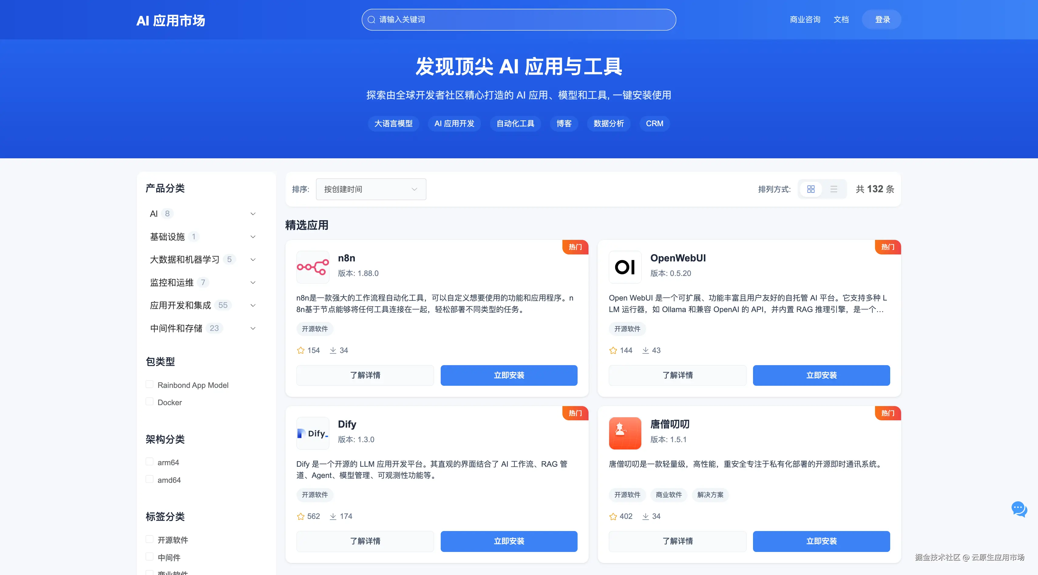 AI 应用市场是各类开源软件的宝藏汇聚地,里面涵盖了 AI、博客、运维、CRM、ERP 等多种类型的应用。在这里,你能轻松找到各种实用工具,所有应用均提供免费使用服务,享受即点即用的便捷体验。