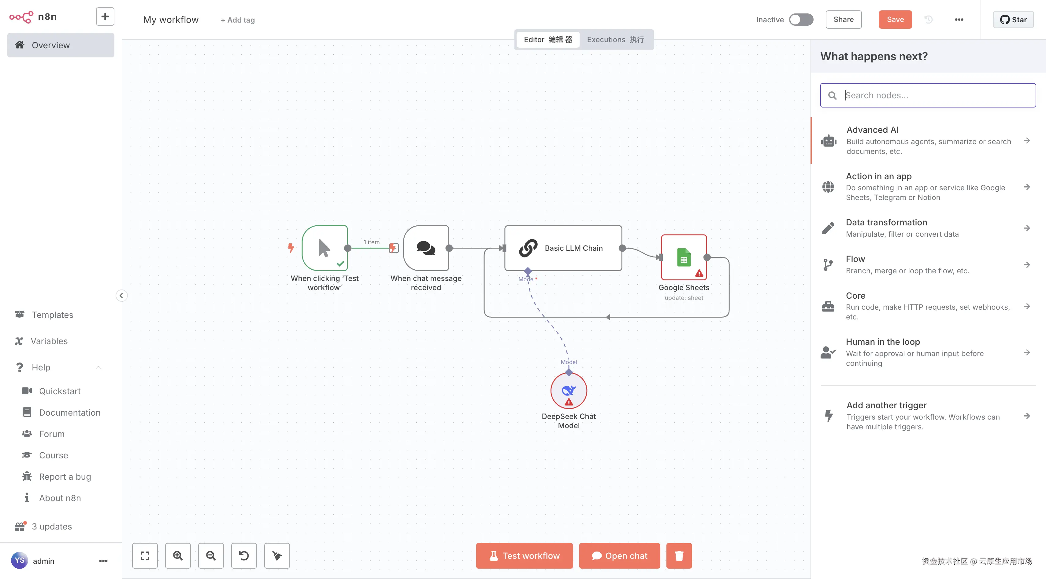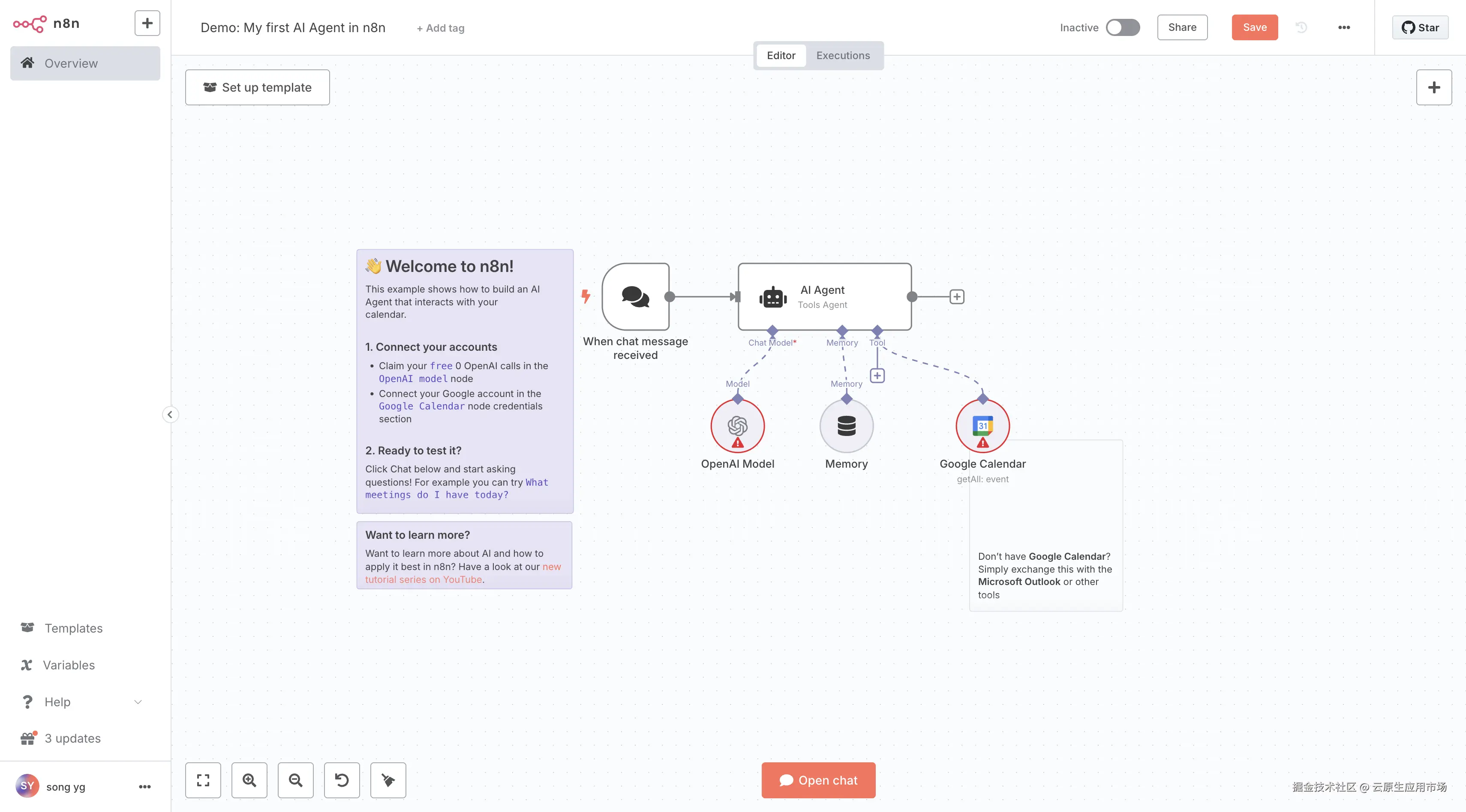 搭建工作流程就像搭积木一样简单。在 n8n 的界面里,你只需从左侧的节点库中拖曳各种功能节点,比如触发器、操作节点、过滤器等,然后用线条连接起来,就能创建出复杂的自动化流程。每个节点的配置都有清晰的提示,即使是技术小白也能快速上手。