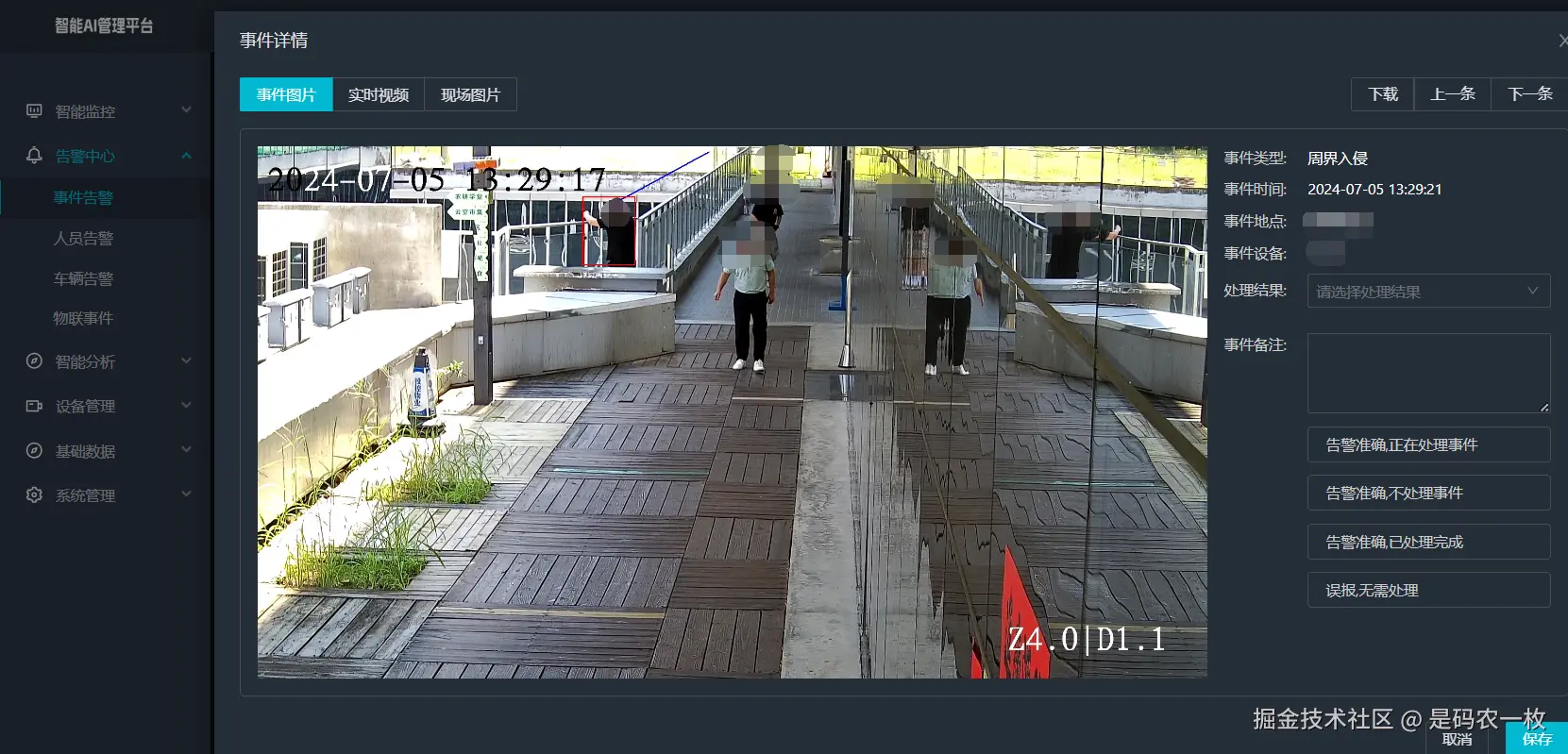 3)告警中心:告警中心将展示所有算法检测出的告警事件,用户可对告警信息进行处理、下载告警图片等。