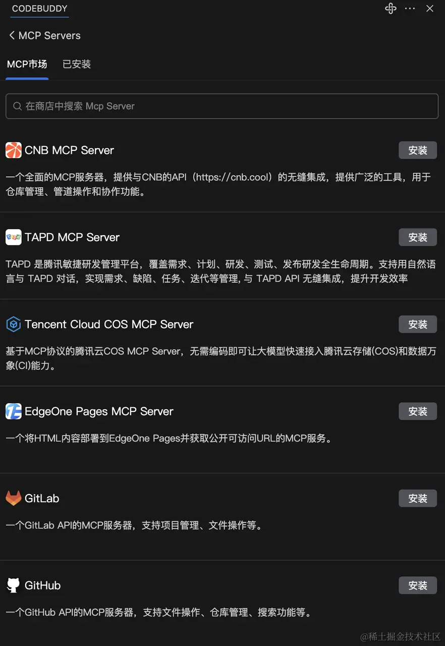 另外,MCP市场也是个不错的特性,你可以方便在这里安装外部服务来增强你的开发工作流: