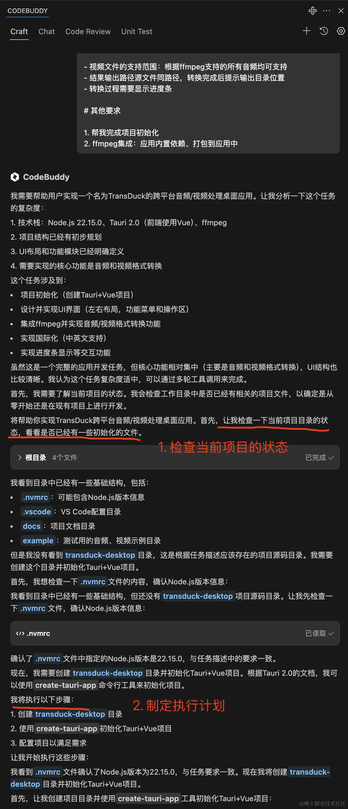 按“回车”开始!如下图,CodeBuddy在对我们的输入思考之后,先扫描当前项目内容,检查项目状态,再根据项目状态制定任务计划: