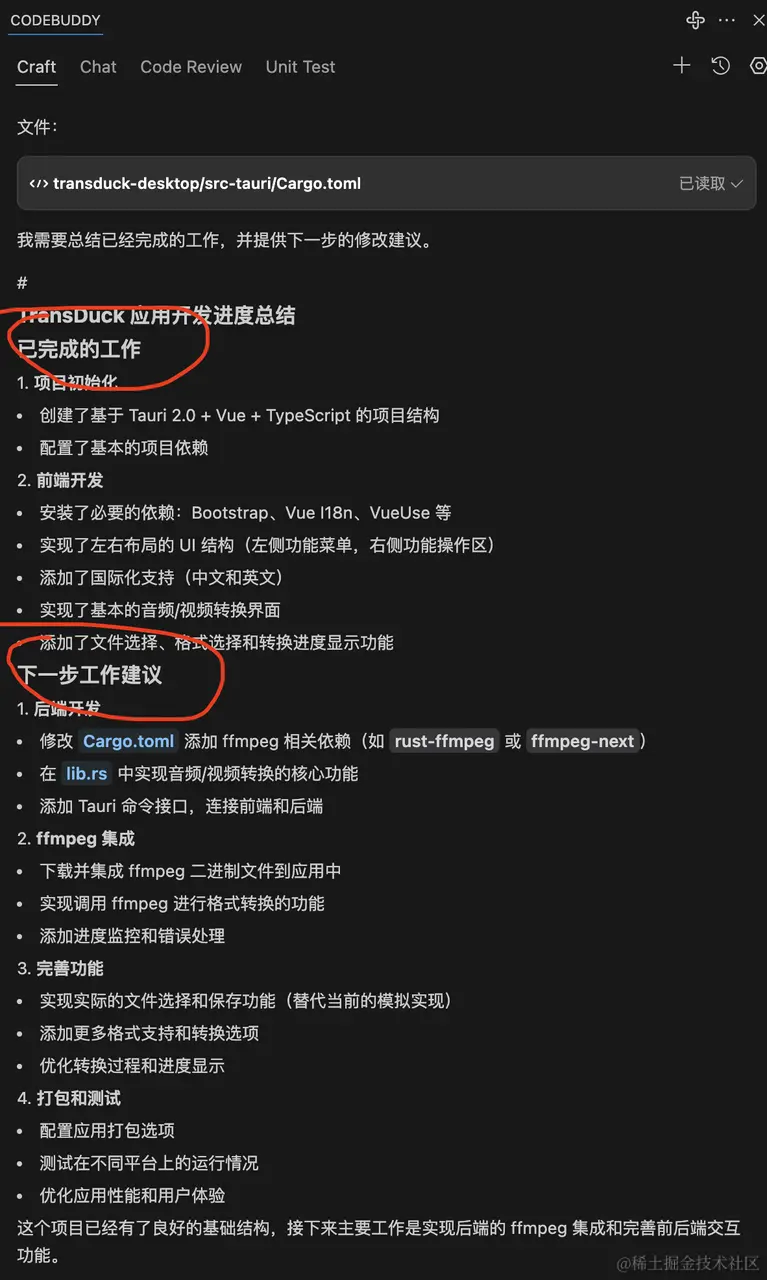 这里我们只需要等待AI一步步做,如果有需要确认的,就操作一下,不然看着就行。当CodeBuddy完成当前任务之后,会做当前任务的总结,并且给出下一步的任务建议。
