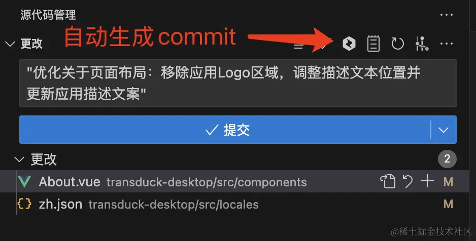 CodeBuddy除了可以帮忙写代码之外,还能帮忙自动生成commit信息,只需要点击下图中的这个按钮即可: