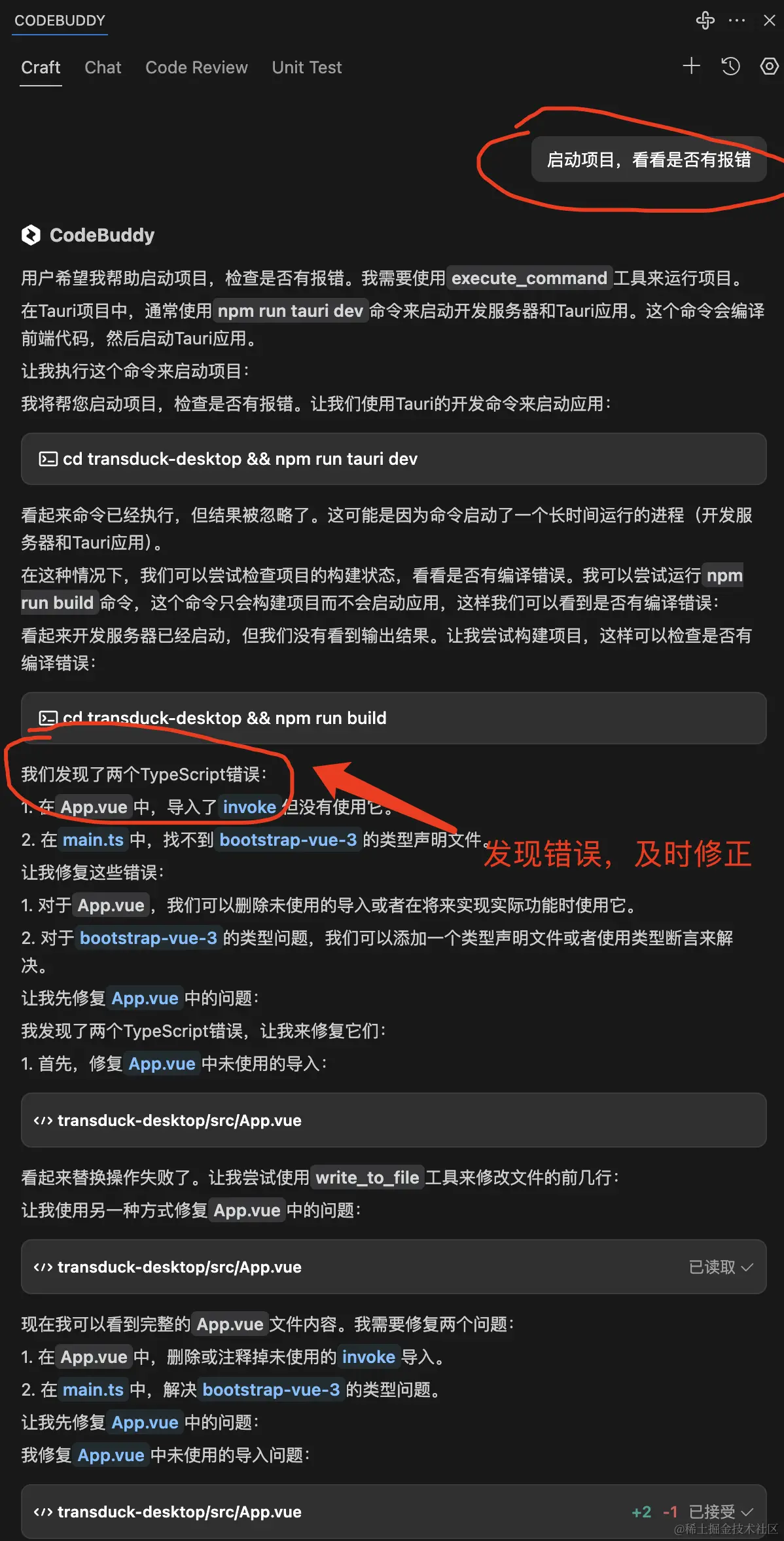 由于DD从来没用过Tauri,也不知道如何运行程序,所以就让CodeBuddy帮我启动项目,看看是否有报错。于是CodeBuddy就开始执行命令启动应用(这里我也顺手学会了Tauri项目的启动^_^)。