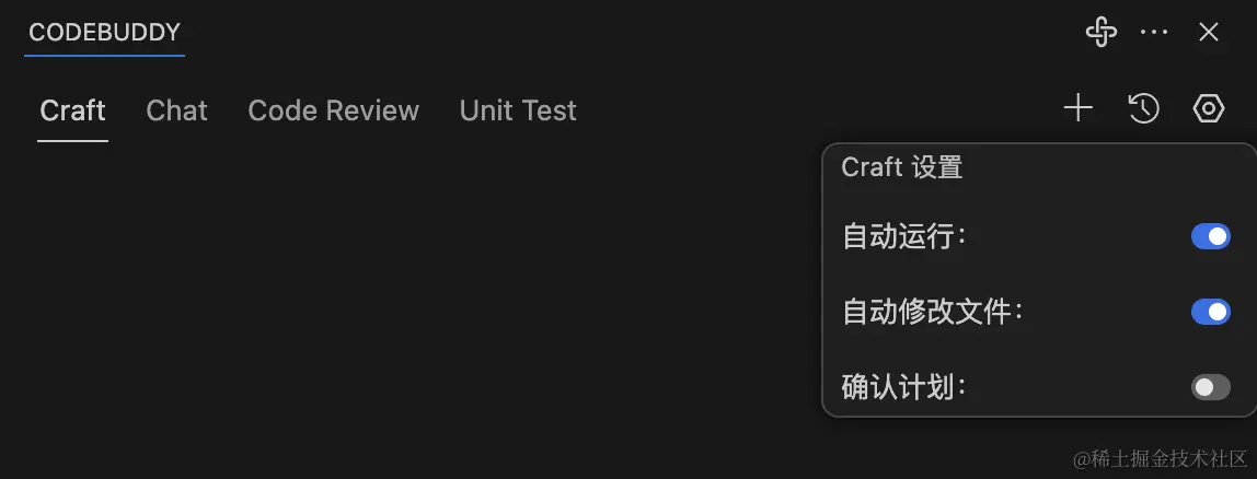 把“自动运行”和“自动修改文件”开启,这样在Craft模式中发消息之后,CodeBuddy会直接帮我们进行开发相关的操作,比如:运行命令、修改文件等。