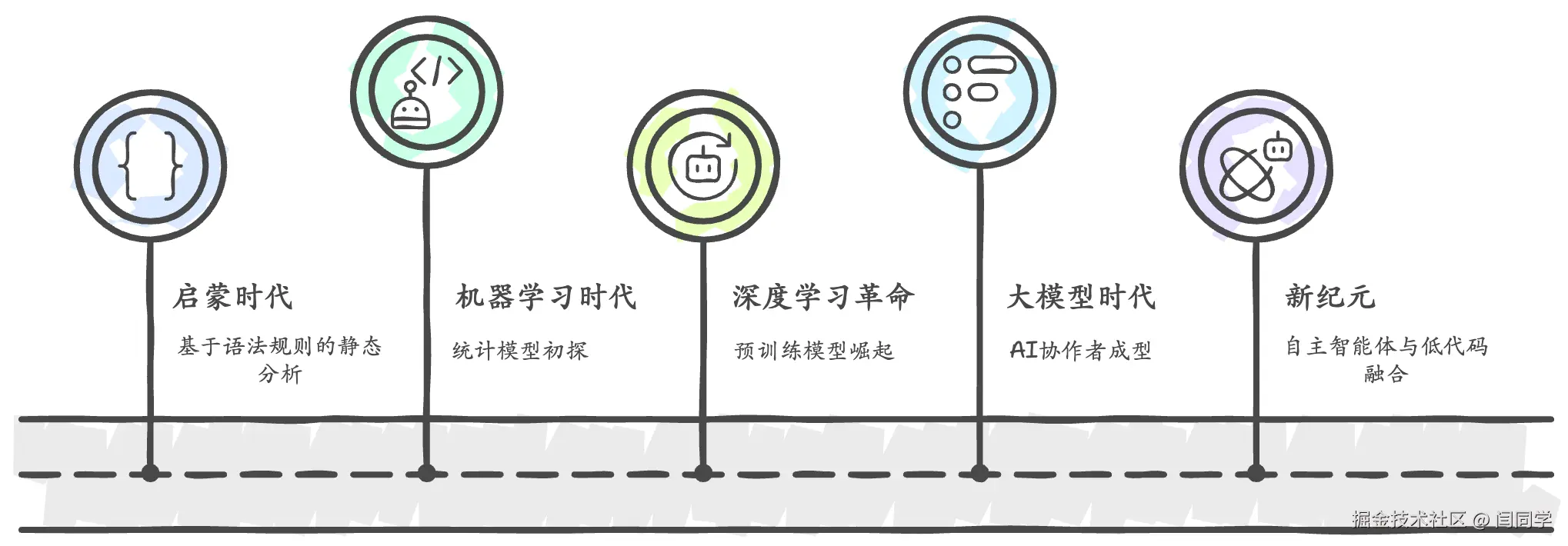 代码助手的发展史可以说是从工具到智能伙伴的演进,总最早期的语法规则补全,到后来的AI机器学习的引入,再到智能体的深度融合,可以说是经过了比较漫长的阶段。