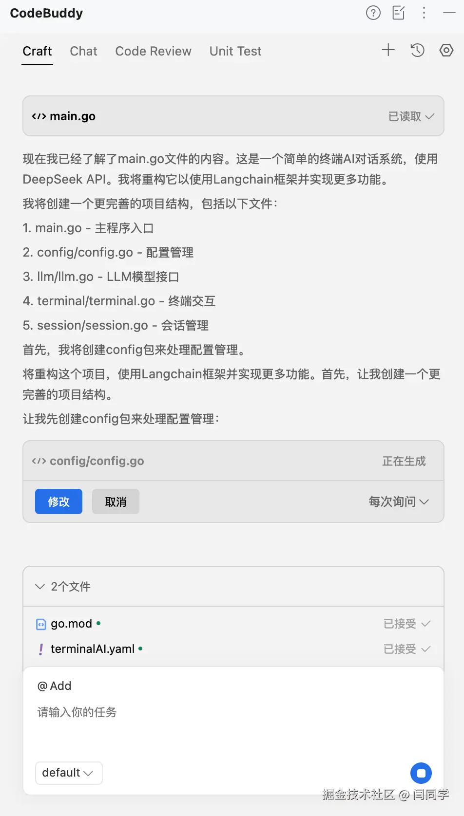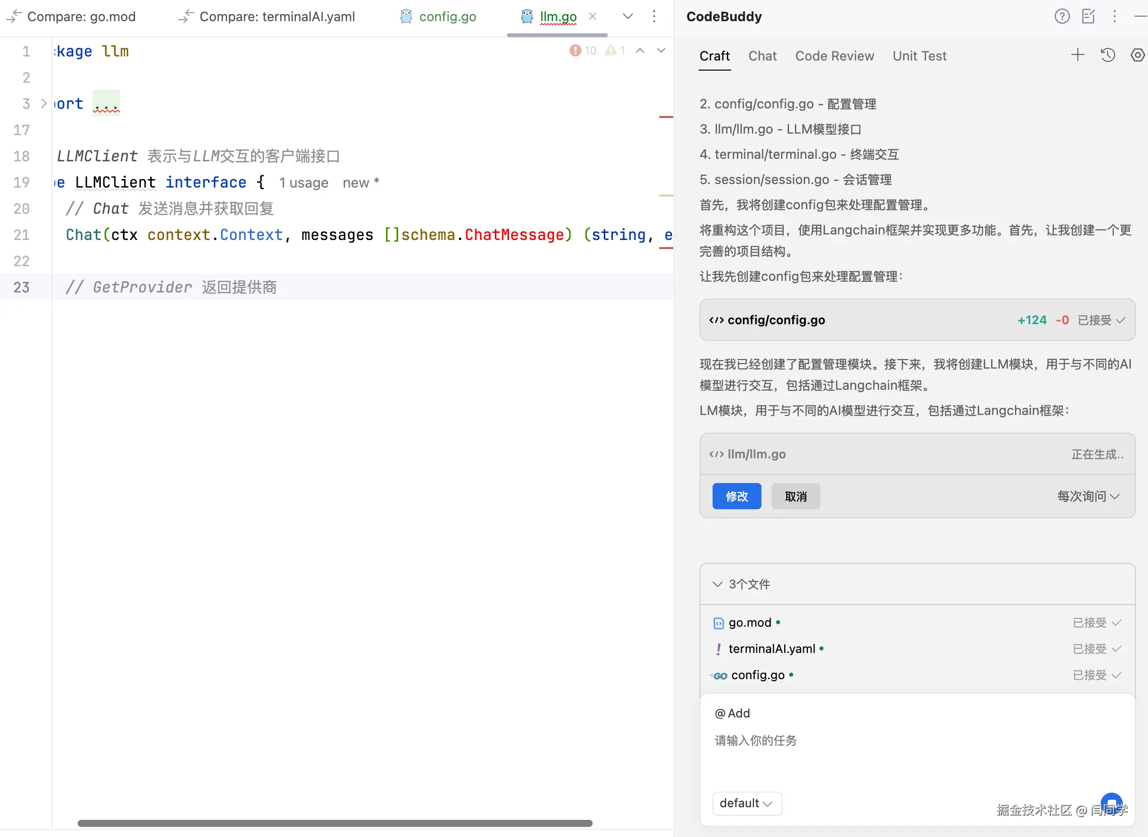 CodeBuddy几乎帮助生成了项目所需的所有核心代码文件,这些代码文件不仅包含了基本的结构定义,还包含了完整的功能实现。并且使用接口进行抽象,提高代码的可测试性和可扩展性,能够遵循Go语言的编码规范和惯例。