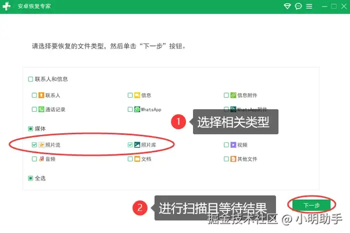 步骤2:选择【照片流】等与手机照片相关的类型,然后点击【下一步】,软件将开始扫描你的手机内存。