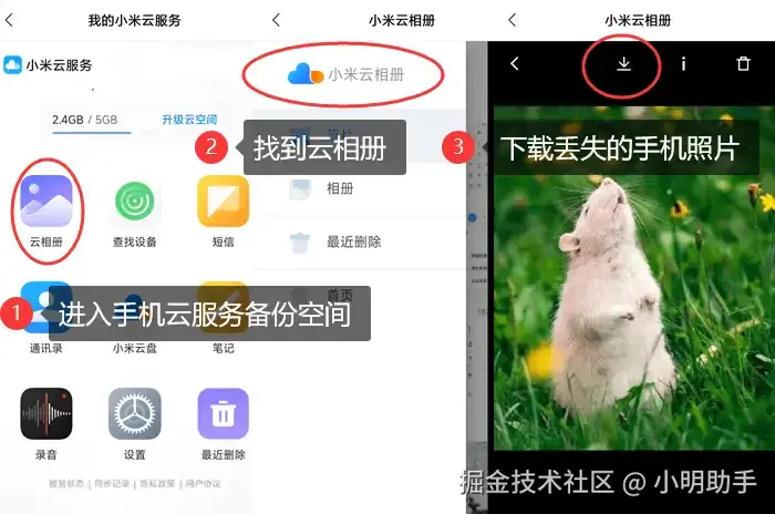 步骤:在云服务应用中,找到【云相册】,获取所有已备份的照片,并将需要的那些下载。