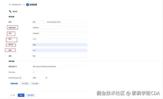 在FineBI中配置数据连接,连接到先前搭建的数据仓库(如MySQL)。