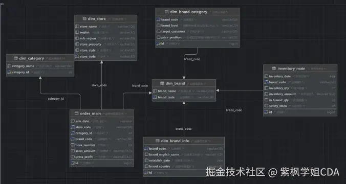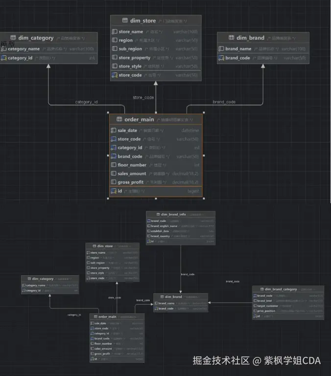 电商案例中常用星型模型,包含一个事实表,包括销售明细事实表order_main,记录销售日期、门店、品类、品牌、销售额、毛利等;多个维度表如“门店维度表dim_store”、“品类维度表dim_category”、“品牌维度表dim_brand”。这些表通过键值关联。