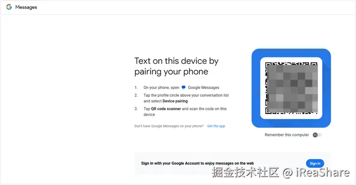 步骤 3: 在计算机上访问 messages.google.com/web。然后使用手机扫描 Google Messages 网页版上显示的二维码。