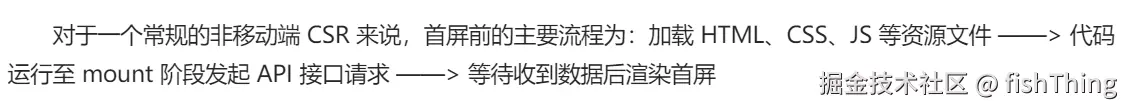 对于一个常规的非移动端 CSR 来说,首屏前的主要流程为:加载 HTML、CSS、JS 等资源文件 ——> 代码运行至 mount 阶段发起 API 接口请求 ——> 等待收到数据后渲染首屏