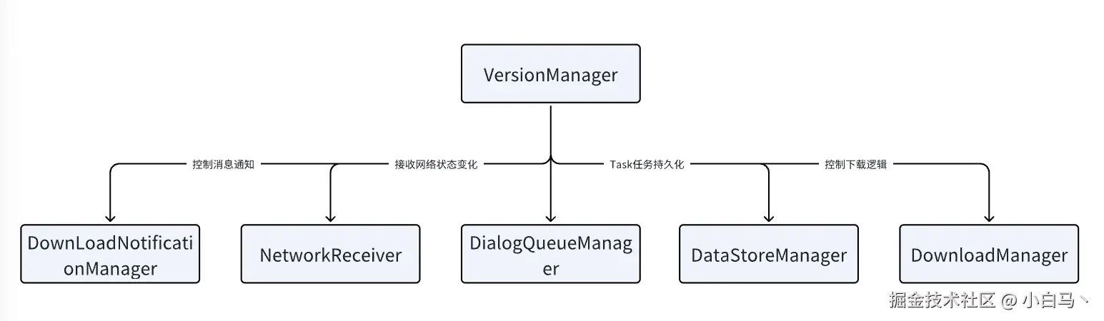 需要一个总控制类VersionManager,协调控制其他的功能类。