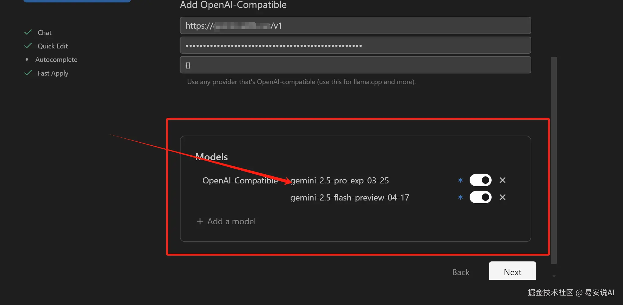 云服务和其他,是支持Google Vertex AI,Azure直接调用的,当然我使用的是OpenAI兼容,搭配我的gemini轮询系统,可以直接调用Gemini2.5pro,记得先添加自己的常用模型,我首选的是:gemini-2.5-pro-exp-03-25,我的配置如下: