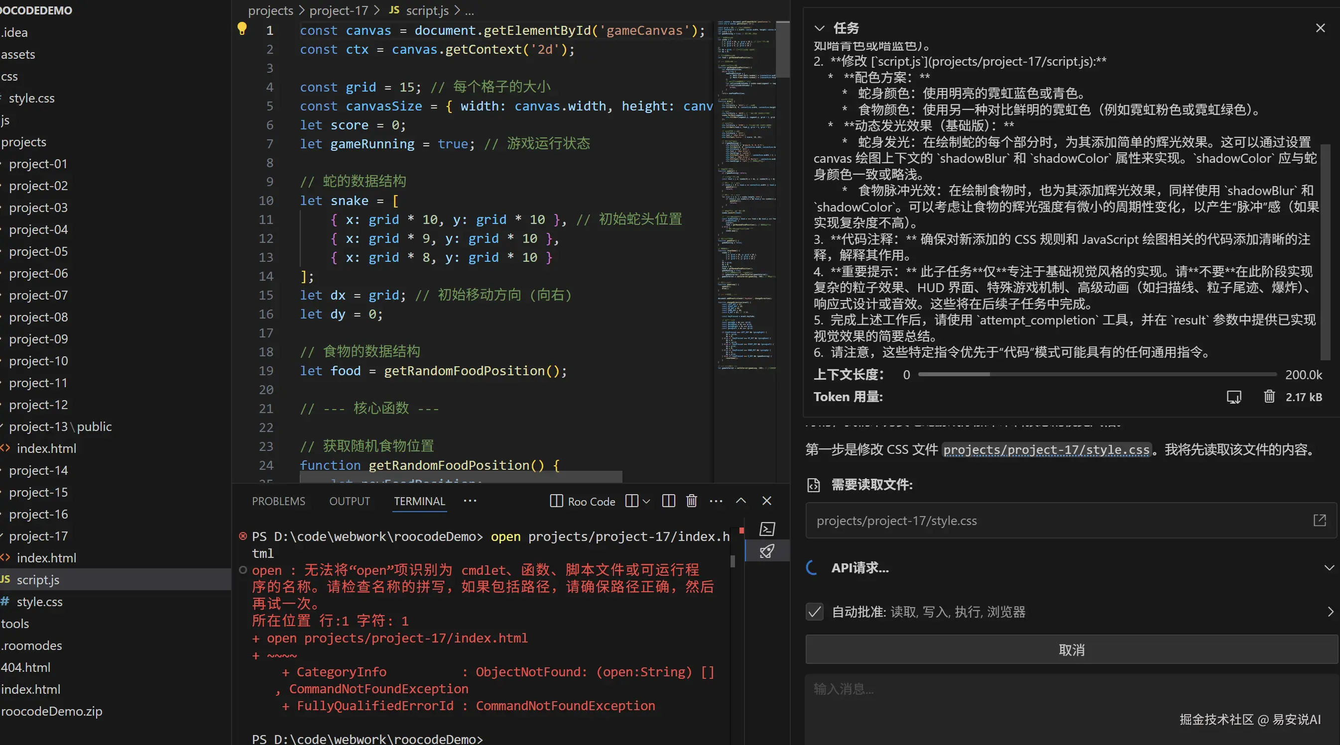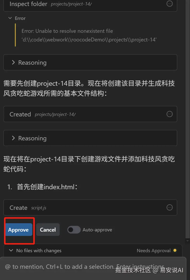 中间创建文件需要用户审批,一个小功能,点了5,6回审批,手都点痛了,不像cursor的yolo模式,可以自动批复,这个功能Jetbrains,roo code都是具备的,目前来看这个IDE有点过于“极简”。