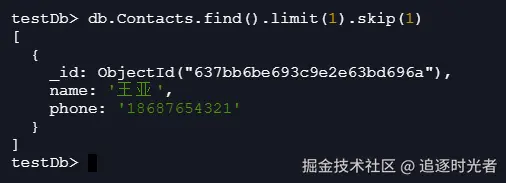 我们除了可以使用limit()方法来读取指定数量的数据外,还可以使用skip()方法来跳过指定数量的数据,skip方法同样接受一个数字参数作为跳过的记录条数。