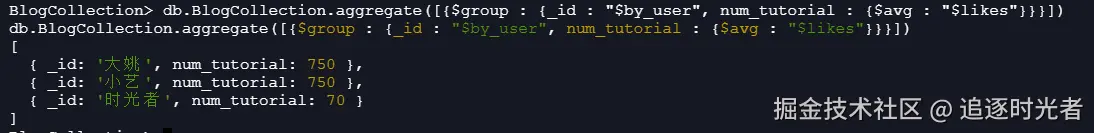 db.BlogCollection.aggregate([{$group : {_id : "$by_user", num_tutorial : {$avg : "$likes"}}}])
