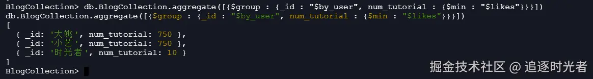 db.BlogCollection.aggregate([{$group : {_id : "$by_user", num_tutorial : {$min : "$likes"}}}])