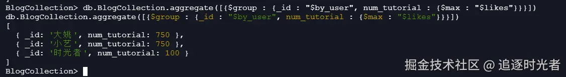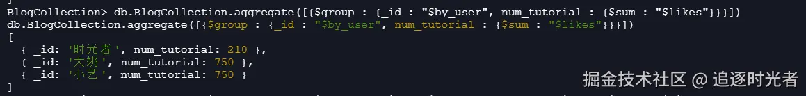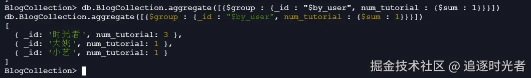 $sum分组统计以上BlogCollection集合每个作者所写的文章数: