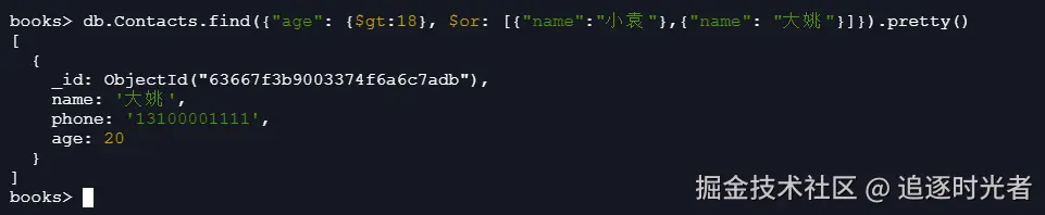 db.Contacts.find({"age": {$gt:18}, $or: [{"name":"小袁"},{"name": "大姚"}]}).pretty()