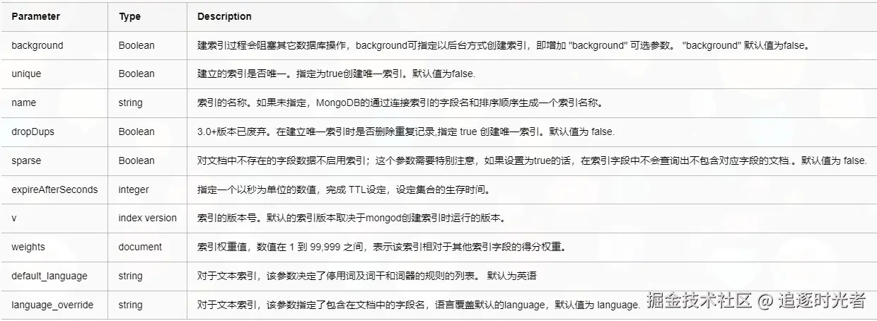 注意:语法中 Key 值为你要创建的索引字段,1 为指定按升序创建索引,如果你想按降序来创建索引指定为 -1 即可。