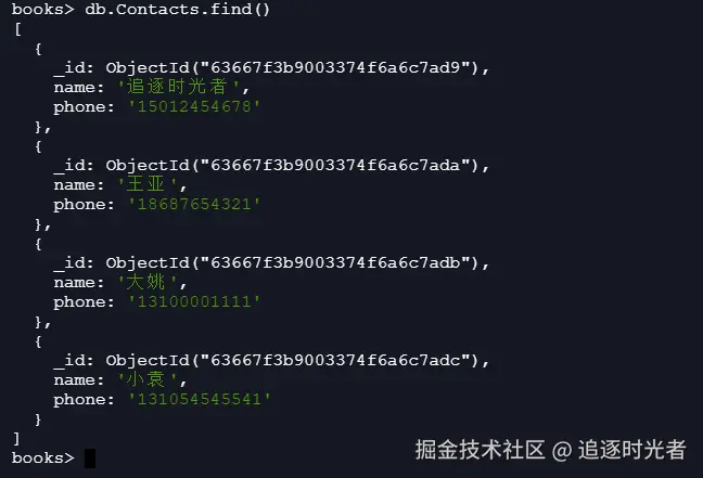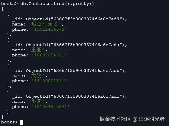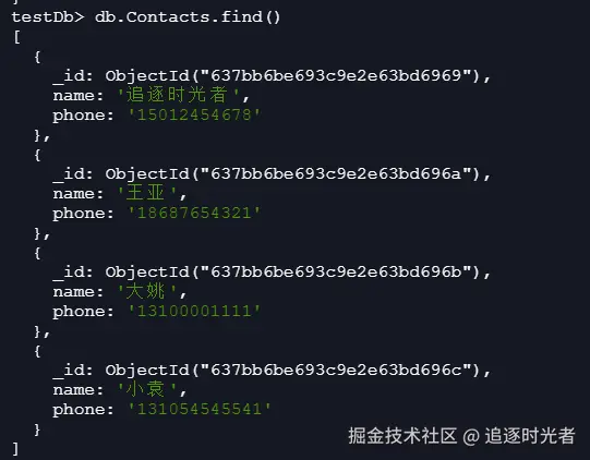 [{ name: "追逐时光者", phone: "15012454678"}, { name: "王亚", phone: "18687654321"}, { name: "大姚", phone: "13100001111"}, { name: "小袁", phone: "131054545541"}]