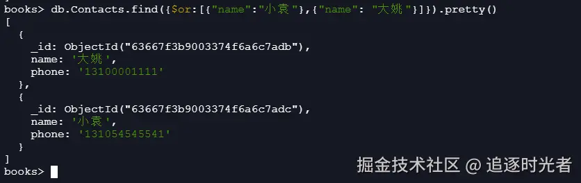 db.Contacts.find({$or:[{"name":"小袁"},{"name": "大姚"}]}).pretty()