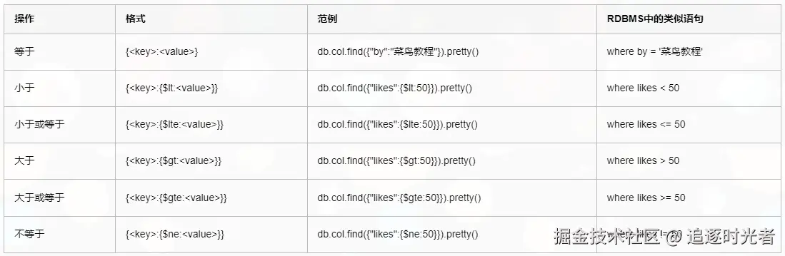 - projection:可选,使用投影操作符指定返回的键。查询时返回文档中所有键值,只需省略该参数即可(默认省略)。