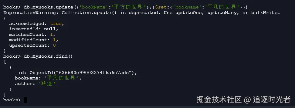db.MyBooks.update({'bookName':'平方的世界'},{$set:{'bookName':'平凡的世界'}})