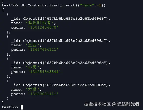 3、以后台方式给Contacts集合中的phone字段按降序设置索引: