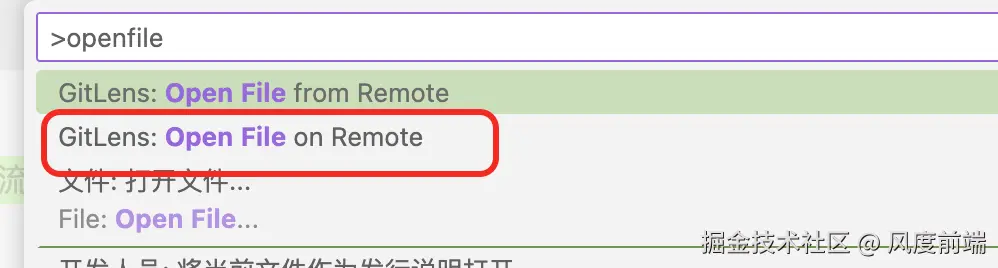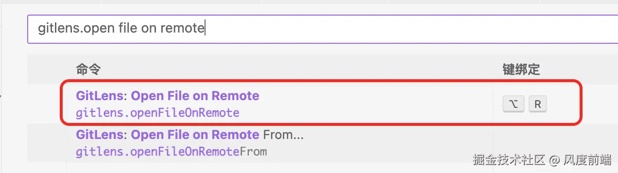 接着在输入框内键入 gitlens.open file on remote,获取到匹配的搜索列表,可以看到第一个就是我们想要的命令,配置键绑定⌘ + ⌥ + r。