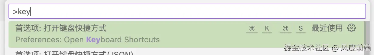 通过cmd + shift + p唤出命令窗口,输入key关键字,选择open keyboard shortcuts打开键盘快捷方式配置: