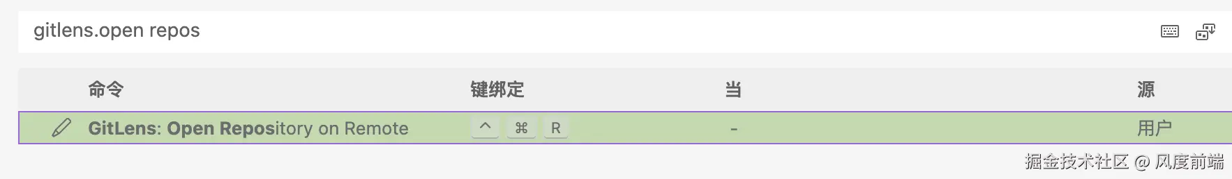 打开键盘快捷方式配置,输入gitlens.open repos,匹配到第一条结果就是我们想要的,将之前方式的快捷键⌘ + ⌃ + r绑定给此命令: