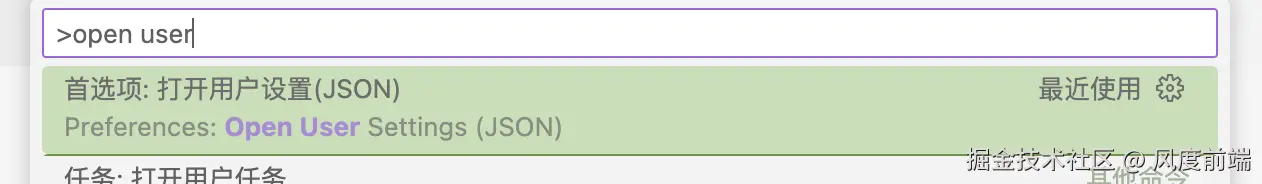 通过cmd + shift + p唤出命令窗口,输入open user打开 用户设置 JSON 模式